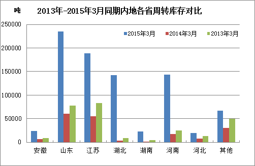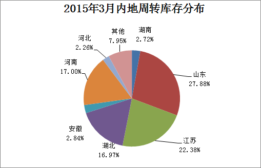 從內(nèi)地庫存分布來看,山東庫存量最大,其次是江蘇、河南及湖北,湖南、河北及安徽庫存較少,其中山東28%,與上月持平;江蘇22%,環(huán)比上升1個百分點;河南17%,環(huán)比下降4個百分點;湖北17%,環(huán)比上升4個百分點;安徽3%,環(huán)比上升2個百分點;湖南3%,與上月持平;河北2%,環(huán)比上升1個百分點。