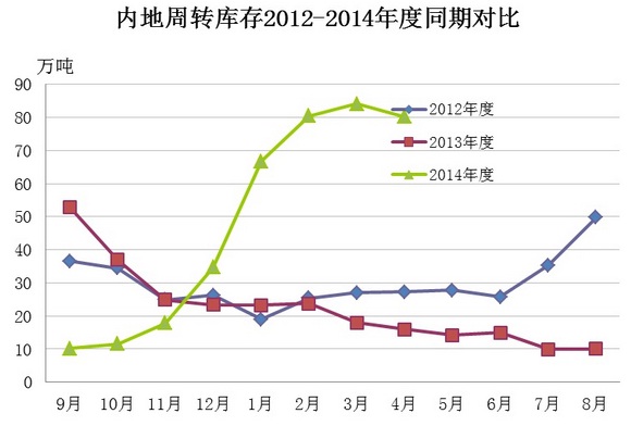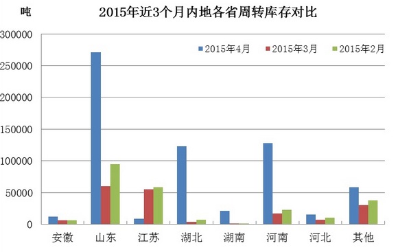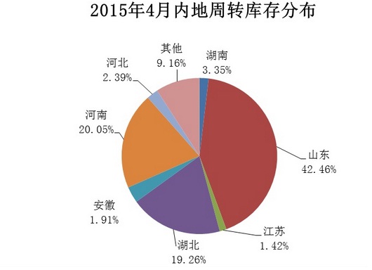 從內(nèi)地庫存量來看,山東庫存量最大,其次是河南、湖北;從庫存變化看,該月山東庫存量增長最多,占比為42.5%,環(huán)比上升15個百分點,江蘇庫存下降最明顯,環(huán)比下降21個百分點,僅占內(nèi)地庫存量的1.4%;此外河南占比20%,環(huán)比上升3個百分點;湖北占比19%,上升2個百分點。其他地區(qū)變動不大。