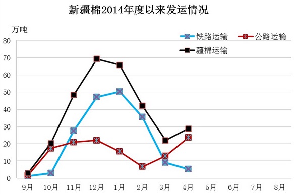 鐵路運輸方面,新疆區(qū)內(nèi)42家中轉站當月通過鐵路向內(nèi)地發(fā)運商品棉5.2萬噸,環(huán)比減少3.9萬噸,同比增加4.2萬噸。據(jù)此推算,4月底新疆棉鐵路運輸在途量約1.2萬噸。公路運輸方面,出疆棉公路運輸甘泉、眉縣核查點統(tǒng)計數(shù)據(jù)顯示,公路出疆23.53萬噸,環(huán)比增加10.68萬噸,增幅83%。