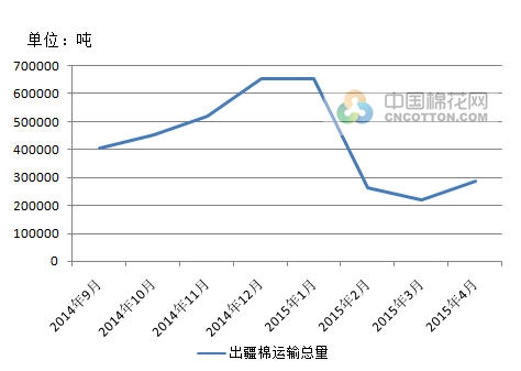 2014年9月-2015年4月公路與鐵路出疆運(yùn)量比較圖 從上圖可以看出,自2015年3月開始,出疆棉公路運(yùn)量便高于鐵路運(yùn)量。多數(shù)棉企選擇公路運(yùn)輸主要原因是3月份公路運(yùn)費(fèi)大幅下降,并且運(yùn)輸方便、快捷,更能保證到貨時間。 2014年9月-2015年4月出疆棉運(yùn)輸總量趨勢圖 從上圖可以看出,出疆棉在2015年1月達(dá)到出疆最高峰,此后出疆運(yùn)量一直呈下降趨勢。主要原因一是新疆優(yōu)質(zhì)皮棉資源所剩不多,難以滿足下游紡企用料需求;二是皮棉現(xiàn)貨價格不斷走低,下游紡企不敢存貨,多數(shù)企業(yè)采取隨用隨買策略。 轉(zhuǎn)載本網(wǎng)專稿請注明:"本文轉(zhuǎn)自錦橋紡織網(wǎng)"。 更多紡織專業(yè)資訊,關(guān)注錦橋紡織網(wǎng)微信公眾號。微信搜:錦橋紡織網(wǎng)