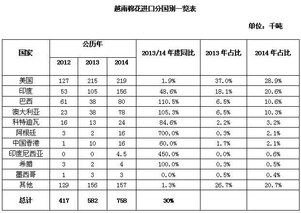 棉花進(jìn)口 由于國(guó)際市場(chǎng)(主要是中國(guó))的紗線需求旺盛,越南棉花進(jìn)口量持續(xù)增加。2014年,越南棉花進(jìn)口量同比增長(zhǎng)30%,達(dá)到75.78萬(wàn)噸,貨值14.5億美元。在中國(guó)棉紗進(jìn)口快速增長(zhǎng)、越南加入歐盟TPP和FTA協(xié)議等諸多利好的促進(jìn)下,2015年越南棉花進(jìn)口量預(yù)計(jì)達(dá)到91萬(wàn)噸,同比增長(zhǎng)20%。 下表所示,美國(guó)仍是越南棉花進(jìn)口的最大來源,2014年美棉占越南棉花進(jìn)口總量的29%,連續(xù)八年占據(jù)越南棉花進(jìn)口的頭把交椅,但印度、澳大利亞和巴西的市場(chǎng)份額正在迅速擴(kuò)大。2014年,美棉對(duì)越南的出口量?jī)H增長(zhǎng)2%,為21.9萬(wàn)噸,印度棉對(duì)越南出口量增長(zhǎng)了49%,巴西棉增長(zhǎng)了110%,澳棉增長(zhǎng)了105%??铺氐贤?、阿根廷、巴基斯坦、中國(guó)和印度尼西亞的增幅也非常明顯。