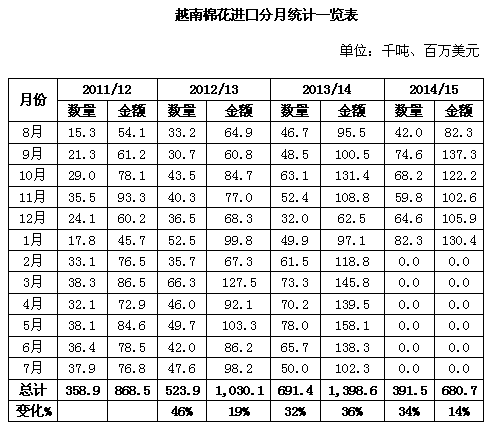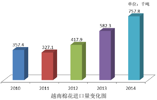 按年度分析,2013/14年度越南棉花進(jìn)口量為69.14萬(wàn)噸,進(jìn)口額14億美元,同比分別增長(zhǎng)32%和36%。2014/15年度前6個(gè)月,越南累計(jì)進(jìn)口棉花39.15萬(wàn)噸,進(jìn)口額6.8億美元,同比分別增長(zhǎng)34%和14%。預(yù)計(jì)本年度越南棉花進(jìn)口總量將達(dá)到83萬(wàn)噸,同比增長(zhǎng)20%,主要原因是國(guó)內(nèi)紡紗生產(chǎn)繼續(xù)擴(kuò)大和紗線出口需求持續(xù)旺盛。