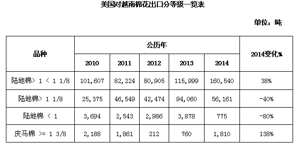 2014年,美國(guó)對(duì)越南出口棉花21.9萬(wàn)噸,同比增長(zhǎng)2%,貨值3.93億美元,同比下降2%。按年度來看,2013/14年度美國(guó)對(duì)越南出口棉花22.32萬(wàn)噸,貨值4.21億美元,同比分別增長(zhǎng)14.6%和20.2%。雖然增速遠(yuǎn)低于前一個(gè)年度,但美棉占越南棉花進(jìn)口的比重仍高達(dá)32.3%。根據(jù)美國(guó)統(tǒng)計(jì)局的數(shù)據(jù),2014/15年度前6個(gè)月美國(guó)對(duì)越南累計(jì)出口9.88萬(wàn)噸棉花,同比增長(zhǎng)8%,但出口額下降了9%,主要原因是越南原棉需求增加而中國(guó)進(jìn)口減少導(dǎo)致國(guó)際棉價(jià)大幅下跌。預(yù)計(jì)2014/15年度美國(guó)對(duì)越南的棉花出口量將維持這個(gè)趨勢(shì),即數(shù)量增加而金額減少。