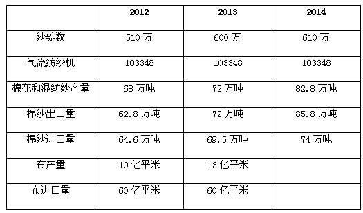 織品出口 根據(jù)越南紡織服裝協(xié)會(huì)的統(tǒng)計(jì),2014年越南紡織品和服裝出口額達(dá)到240億美元,同比增長(zhǎng)19%,增長(zhǎng)步伐快于越南工業(yè)貿(mào)易部制定的計(jì)劃(到2020年使出口額達(dá)到250億美元)。越南與歐盟簽訂的跨太平洋伙伴協(xié)定(TPP)和自由貿(mào)易協(xié)定(FTA)為越南紡織品和服裝產(chǎn)業(yè)的發(fā)展提供了巨大的發(fā)展機(jī)遇。目前,美國(guó)仍是越南紡織品和服裝出口的最大市場(chǎng)。2014年,越南對(duì)美國(guó)的服裝出口額為98億美元,占出口總額的41%。 越南是亞洲為數(shù)不多近幾年紡紗產(chǎn)能擴(kuò)大的國(guó)家之一,截至2014年紡紗廠超過100家,紗錠數(shù)量為610萬(wàn)錠,2015年預(yù)計(jì)達(dá)到630萬(wàn)錠,棉紗和混紡紗的產(chǎn)能為82.8萬(wàn)噸。由于中國(guó)、土耳其和韓國(guó)的紗線需求旺盛,2014年越南棉紗達(dá)到85.8萬(wàn)錠的歷史新高,同比增長(zhǎng)19%。越南生產(chǎn)的紗線有65%用于出口,下表是越南紡織業(yè)的總體情況: