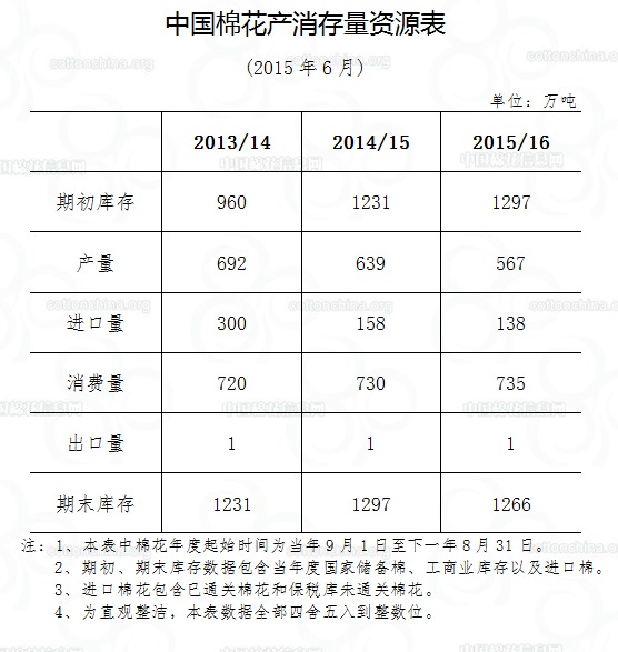 中國(guó)棉花產(chǎn)消存量資源表(2015年6月)