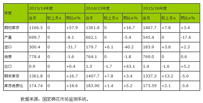 7月份,國(guó)家棉花市場(chǎng)監(jiān)測(cè)系統(tǒng)對(duì)國(guó)內(nèi)產(chǎn)銷存預(yù)測(cè)數(shù)據(jù)做以下調(diào)整:調(diào)增2014/15年度國(guó)內(nèi)棉花進(jìn)口量6.1萬(wàn)噸至179.7萬(wàn)噸,2014/15年度國(guó)內(nèi)棉花期末庫(kù)存增加7.8萬(wàn)噸至1407.7萬(wàn)噸,期末庫(kù)存消費(fèi)比為183.9%,較上月提高1.4個(gè)百分點(diǎn)。調(diào)增2015/16年度國(guó)內(nèi)棉花進(jìn)口3.8萬(wàn)噸至183.9萬(wàn)噸,2014/15年度國(guó)內(nèi)棉花期末庫(kù)存增加13.2萬(wàn)噸至1337.3萬(wàn)噸,期末庫(kù)存消費(fèi)比為171.6%,較上月提高2.1個(gè)百分點(diǎn)。