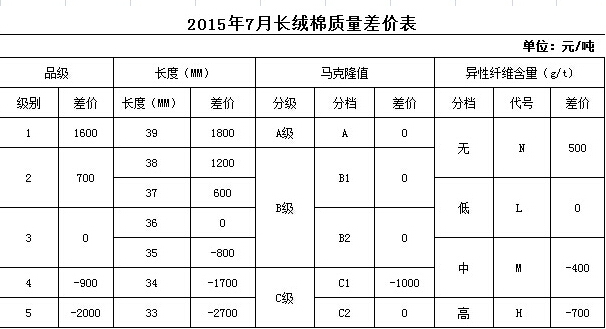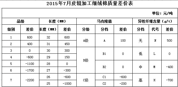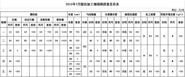 2015年7月《中國棉花協(xié)會(huì)國產(chǎn)棉質(zhì)量差價(jià)表》