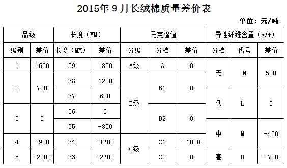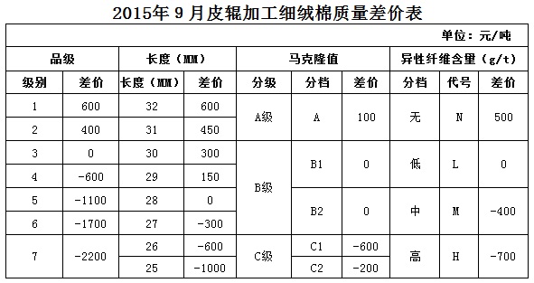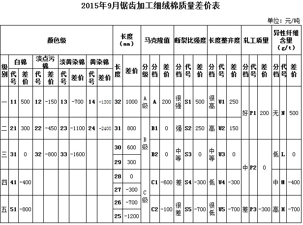 根據(jù)《中國棉花協(xié)會國產(chǎn)棉質(zhì)量差價表定期發(fā)布辦法》的規(guī)定,2015年9月《鋸齒加工細絨棉質(zhì)量差價表》、《皮輥加工細絨棉質(zhì)量差價表》和《長絨棉質(zhì)量差價表》正式發(fā)布。
