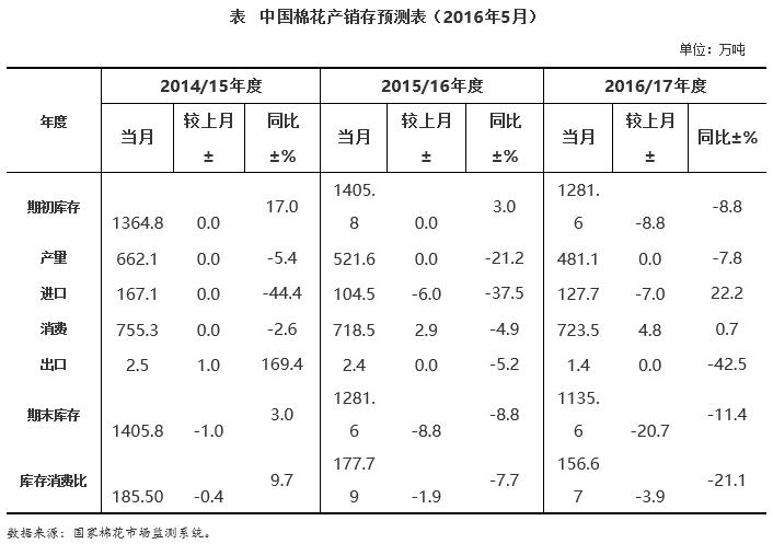 5月份,國家棉花市場監(jiān)測系統(tǒng)產(chǎn)銷存預(yù)測對2015/16年度、2016/17年度進(jìn)口量和消費量有所調(diào)整。根據(jù)當(dāng)前實際進(jìn)口情況,棉花進(jìn)口量預(yù)測水平有所下調(diào);外紗沖擊減緩,用棉量呈現(xiàn)回暖趨勢,棉花消費量小幅上調(diào)。