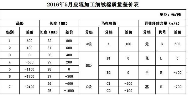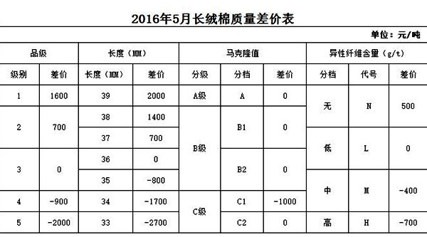 按照“優(yōu)質(zhì)優(yōu)價(jià)”和紡織企業(yè)對(duì)棉花內(nèi)在品質(zhì)需求的原則,本月對(duì)質(zhì)量差價(jià)表做了以下調(diào)整: