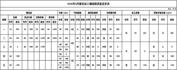 本次《鋸齒加工細(xì)絨棉質(zhì)量?jī)r(jià)差表》調(diào)整中(單位:元/噸),白棉一級(jí)、二級(jí)與標(biāo)準(zhǔn)級(jí)的價(jià)差由400、200擴(kuò)大至500、300,白棉五級(jí)與標(biāo)準(zhǔn)級(jí)的價(jià)差由-650擴(kuò)大至-750;斷裂比強(qiáng)度S1、S2與標(biāo)準(zhǔn)級(jí)的價(jià)差由400、200擴(kuò)大至500、250,斷裂比強(qiáng)度S4、S5與標(biāo)準(zhǔn)級(jí)的價(jià)差由-300、-700擴(kuò)大至-350、-800。