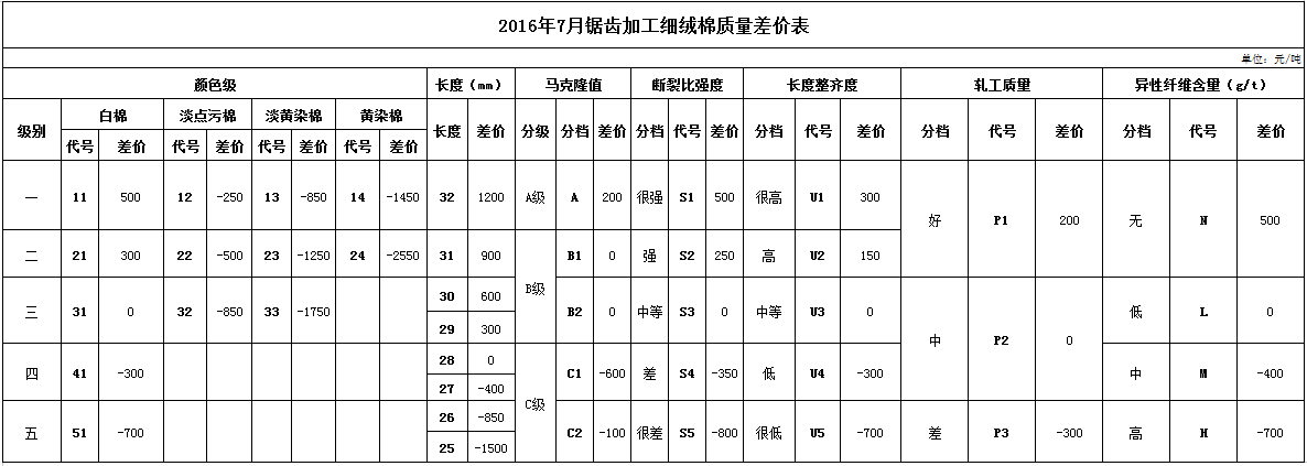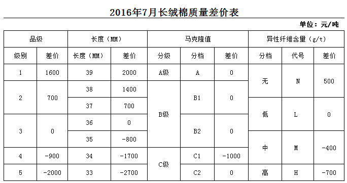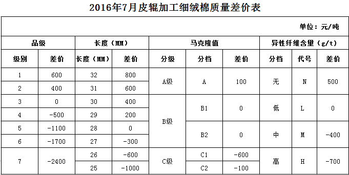 日前,中國棉花協(xié)會正式發(fā)布2016年7月《鋸齒加工細絨棉質量差價表》、《皮輥加工細絨棉質量差價表》和《長絨棉質量差價表》,各指標價差幅度維持6月份水平。