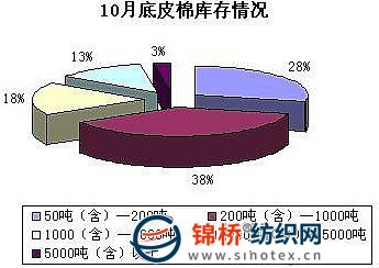 10月在經(jīng)歷國(guó)慶長(zhǎng)假后棉花市場(chǎng)近乎演義著瘋狂的上漲局面,現(xiàn)貨價(jià)格一路高開高走。當(dāng)月全國(guó)采摘已經(jīng)進(jìn)入掃尾階段,收購(gòu)進(jìn)度普遍加快,大多數(shù)棉區(qū)收購(gòu)已經(jīng)過半,局部因?yàn)殛幱晏鞖庥绊懞兔揶r(nóng)惜售等情況收購(gòu)進(jìn)度相對(duì)較緩。當(dāng)月皮棉銷售利潤(rùn)因?yàn)槠髽I(yè)入市時(shí)間及加工和收購(gòu)成本不同而存在較大差異。當(dāng)月新疆棉外運(yùn)困難,內(nèi)地各棉商及加工廠看好后市積極囤棉,一些紡織廠反映購(gòu)棉難。為全面了解企業(yè)庫(kù)存、銷售、市場(chǎng)資金等情況,進(jìn)行此次調(diào)查,現(xiàn)將調(diào)查結(jié)果公布如下: 1.商業(yè)庫(kù)存總量216萬(wàn)噸 通過對(duì)棉花企業(yè)進(jìn)行分省、分規(guī)模抽樣調(diào)查,統(tǒng)計(jì),截止2009年10月底國(guó)內(nèi)棉花商業(yè)庫(kù)存總量216萬(wàn)噸(包括外棉,不包括國(guó)儲(chǔ)棉),較9月底的85萬(wàn)噸增加131萬(wàn)噸。其中內(nèi)地商業(yè)庫(kù)存115萬(wàn)噸;新疆商業(yè)庫(kù)存(未出疆)101萬(wàn)噸。內(nèi)地產(chǎn)區(qū)中,黃河流域的冀魯豫3省共有庫(kù)存55萬(wàn)噸,長(zhǎng)江流域的蘇皖鄂湘4省共有庫(kù)存46萬(wàn)噸,其他分散產(chǎn)區(qū)14萬(wàn)噸。 2.企業(yè)庫(kù)存分散不均衡 中低檔庫(kù)存占最多 2009年10月相比2008年同期而言是1個(gè)截然相反的市場(chǎng)。國(guó)內(nèi)棉花現(xiàn)貨價(jià)格跟隨國(guó)儲(chǔ)棉競(jìng)價(jià)上漲迅速,隨著收購(gòu)和加工成本的不斷高漲,皮棉銷售價(jià)格上漲幅度在600元/噸左右。各大棉花企業(yè)在10月的時(shí)候開始積極收購(gòu)加工,囤積力度相對(duì)加大,皮棉報(bào)價(jià)普遍較高,銷售趨于緩慢。據(jù)調(diào)查,28%的企業(yè)存棉量在50-200噸;38%的企業(yè)庫(kù)存量在200-1000噸;18%的企業(yè)存棉量在1000-2000噸;13%的企業(yè)存棉量為2000-5000噸;3%的企業(yè)存棉在5000噸以上。(如下圖)
