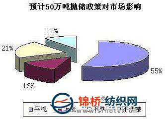 4.企業(yè)認(rèn)為50萬(wàn)噸拋儲(chǔ)政策出臺(tái)棉市將保持穩(wěn)定 10月底第2批拋儲(chǔ)計(jì)劃圓滿完成,而市場(chǎng)棉價(jià)在拋儲(chǔ)完之后繼續(xù)跟隨電子盤市場(chǎng)出現(xiàn)進(jìn)一步上漲。月底市場(chǎng)上有關(guān)繼續(xù)輪出儲(chǔ)備棉和發(fā)放配額的傳聞,使得現(xiàn)貨價(jià)格有小幅回落。但是隨著政策一直未能落實(shí),皮棉價(jià)格又維持小慢漲行情。多數(shù)企業(yè)認(rèn)為,市場(chǎng)缺口比較大,國(guó)家出臺(tái)50萬(wàn)噸拋儲(chǔ)棉政策也是為穩(wěn)定棉市。因此認(rèn)為后市棉價(jià)平穩(wěn)的企業(yè)占55%;而認(rèn)為國(guó)家政策會(huì)造成市場(chǎng)棉價(jià)下跌的企業(yè)占21%;有13%的企業(yè)認(rèn)為即使拋儲(chǔ)也很難撼動(dòng)高成本控制下的市場(chǎng)棉價(jià),隨著缺口越來(lái)越大,棉價(jià)將繼續(xù)上漲。還有11%對(duì)此不做評(píng)論。