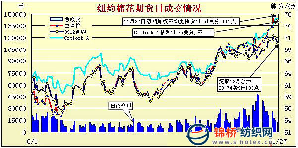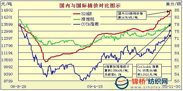 5.國際棉價高位寬幅震蕩,11月后半月再度展開新一輪上漲攻勢,價格水平達(dá)75美分。受我國棉市變動影響,國際棉價繼10月后半月第1輪大漲行情后,11月后半月再度展開新1輪上漲行情,價格水平均接近和突破75美分,是歷年來較高的價位水平。從11月13-25日紐約期棉主體價由69.04美分猛升至75.65美分,上漲660點,漲幅9.6%;國際棉價CotlookA指數(shù)由70.65美分漲至74.95美分,漲430點,漲幅6.1%。直此自9月來紐約期棉本年度累計上漲1559點(約合2900元),漲幅26.3%;國際棉價A指數(shù)本年度累計漲1290點(約合2400元),漲幅20.8%。其中10-11月分別上漲1257點和1140點,折合人民幣分別上漲2360元和2200元,漲幅快于我國國內(nèi)棉價。
