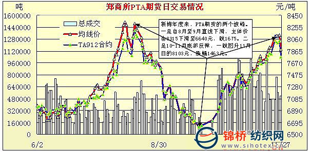 7.化纖短纖伴隨棉價上漲穩(wěn)步提升。由于棉花在高棉價區(qū),紡織企業(yè)盡可能使用替代纖維,混紡紗比重由上年同期的9.4%提升至9.5%,純化纖紗比重由12.4%年升到12.6%,純化纖布由27.3%提升至27.6%。 在需求拉動及成本推動下,持續(xù)低迷不掁的聚酯纖維PTA期貨、滌綸短纖10-11月成功實現(xiàn)底部穩(wěn)健反彈。PTA期貨各合約主體價9月末的6640元直線回升至8103元,基本回復(fù)至此前8-9月直線下滑的頂部。