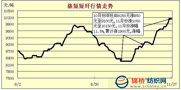 滌綸短纖現(xiàn)貨主體價由9月末的8250元上升至10月的9100元,11月的10150元,這是自金融危機來滌綸短纖首次過萬元關(guān),10-11月漲幅分別達(dá)850元和1050元。