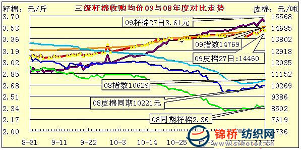 2.籽棉收購價大幅提升,收購成本倒掛。新花年度來籽棉收購價呈高開高走態(tài)勢,與上年度低開低走形成明顯反差。籽棉收購價已經(jīng)創(chuàng)歷年來最高水平,成本倒掛情況十分嚴(yán)重,這也是推動現(xiàn)貨棉價快速上漲的因素之一。從新棉收購價情況看,籽棉收購價由開盤時的2.87元一路上升至目前的平均3.6元,累計漲幅24.1%,截止11月27日籽棉收購均價由2.9元左右漲至3.61左右,漲幅25%以上,其中10月漲13%,11月漲5.9%,同比上年漲幅52%以上。皮棉成本由12400元一路上升到1440元左右,累計上漲2000元,漲幅15.3%,其中10月漲1000元,漲幅7.8%,11月漲630元,漲幅3.6%,同比上年度漲4200多元,漲幅41%左右。由于11月下旬現(xiàn)貨棉價漲速加快,新棉收購成本倒掛情況略有改善。本年度新棉收購行情圖示如下: