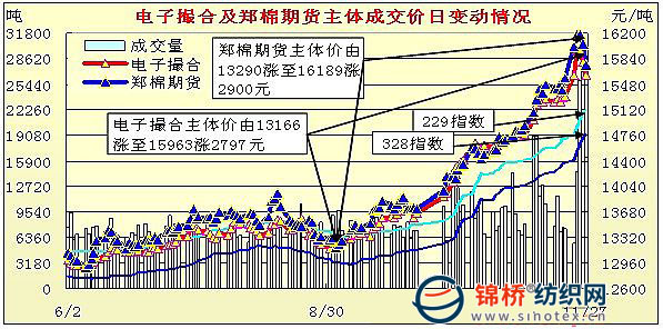 3.電子撮合和鄭棉期貨10月開始直線上揚,主體價接近和突破16000元。10月來,電子撮合、鄭棉期貨交易十分活躍,呈量價齊升態(tài)勢,成交價更是直線上沖。截止11月26日電子撮合主體價接近1.6萬至15781元/噸,較上年度末漲2800元/噸,漲幅21.2%;鄭棉期貨主體價突破1.6萬元至16048元/噸,漲2900元左右,漲幅21.8%。電子撮合和鄭棉期貨首期合約價與現(xiàn)貨棉價比較,分別高于現(xiàn)貨棉價260元和900元左右。值得一提的是,隨著棉花進(jìn)口配額消息的發(fā)布,電子撮合和鄭棉期貨當(dāng)日分別做出反應(yīng),26-27日價格雙雙回落。
