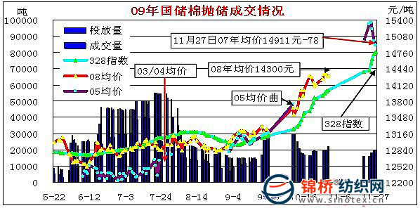 4.國儲棉是企業(yè)獲取資源的主渠道,競價十分激烈,“烘掄”競價升至15400左右。由于新棉上市推遲及新棉質(zhì)疵價高,國儲棉被受紡織企業(yè)青睞和關(guān)注。每日參拍企業(yè)達(dá)300-500家,能夠競拍成功的僅占10%左右,競價十分激烈。 從國儲棉成交價走勢情況看,自拋儲至9月,國儲棉呈波浪式緩慢上移,總體相對平穩(wěn),成交價基本在13000元上下波動。10月國儲棉被快速拉漲,由13100元左右拉升到10月末的14300元,漲幅1100元以上。11月20日第3批50萬噸拋儲開市,從近5個交易情況看,頭3天不樂觀,價格再度猛漲至15300元,最高價達(dá)15900元,也引發(fā)現(xiàn)貨、期貨棉價大幅追漲。因為棉花進(jìn)口配額消息的發(fā)布,國儲棉后2個交易日價格明顯回落。不難看出,從目前市場情況看,國儲棉向下調(diào)控已經(jīng)無能力,發(fā)放配額對現(xiàn)行市場有一定壓力。