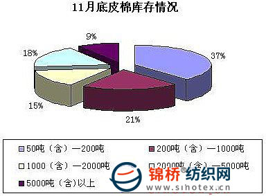 11月棉市穩(wěn)步上漲,現(xiàn)貨市場(chǎng)收購(gòu)及加工都接近尾聲,不少企業(yè)在月中積極囤棉,棉花庫(kù)存較上月有所增加。但是隨著月末市場(chǎng)出現(xiàn)波動(dòng),不少企業(yè)的存棉及銷售規(guī)劃被打亂,中檔庫(kù)存企業(yè)逐漸轉(zhuǎn)向高、低兩極分化,企業(yè)庫(kù)存量差距就此拉開(kāi)。據(jù)調(diào)查,37%的企業(yè)存棉量在50-200噸,較上月增加9個(gè)百分點(diǎn);21%的企業(yè)存棉量在200-1000噸,較上月減少17個(gè)百分點(diǎn);15%的企業(yè)存棉量在1000-2000噸,較上月減少3個(gè)百分點(diǎn);18%的企業(yè)存棉量在2000-5000噸,較上月增加5個(gè)百分點(diǎn);9%的企業(yè)存棉量在5000噸以上,較上月增加6個(gè)百分點(diǎn)。(如下圖)