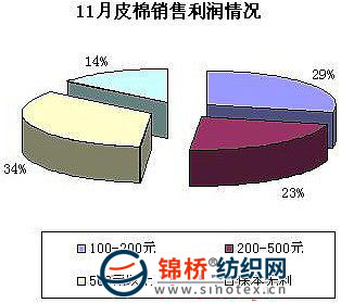 11月總體而言皮棉現(xiàn)貨市場(chǎng)普遍比較看好,棉市基本處于上行軌道。從調(diào)查企業(yè)看,月內(nèi)企業(yè)銷售利潤(rùn)普遍較高,銷售情況月中前期惜售,后期略顯積極。具體看,銷售利潤(rùn)在500元以上的企業(yè)占34%,較上月增加26個(gè)百分點(diǎn);銷售利潤(rùn)在100-200元的企業(yè)占29%,較上月減少13個(gè)百分點(diǎn);銷售利潤(rùn)在200-500元的企業(yè)占23%;較上月減少3個(gè)百分點(diǎn);保本無(wú)利的企業(yè)占14%,較上月減少10個(gè)百分點(diǎn)。