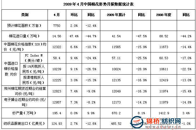 4月份新棉收儲(chǔ)工作全部結(jié)束,籽棉收購(gòu)基本完成,加工進(jìn)入最后階段。在收儲(chǔ)政策支撐下,國(guó)內(nèi)籽棉收購(gòu)和棉花銷售價(jià)格持續(xù)回升,恢復(fù)至年度初期價(jià)位。收儲(chǔ)結(jié)束之后,受資源暫時(shí)結(jié)構(gòu)性緊張影響,價(jià)格上漲速度加快,月底在拋儲(chǔ)預(yù)期和紡織企業(yè)承受能力雙重壓力之下,漲幅趨緩。4月中國(guó)棉花價(jià)格指數(shù)(CCIndex328)均價(jià)12322元/噸,環(huán)比上漲6.6%,同比下跌10.7%,當(dāng)月累計(jì)上漲近千元。同時(shí),鄭州棉花期貨和交易市場(chǎng)電子撮合價(jià)格也加速上漲,漲幅大于現(xiàn)貨,月底進(jìn)入整理階段。 在各國(guó)政府多項(xiàng)刺激經(jīng)濟(jì)政策之下,4月世界經(jīng)濟(jì)衰退步伐放緩,市場(chǎng)信心有所恢復(fù),國(guó)際棉價(jià)出現(xiàn)大幅反彈。但與國(guó)內(nèi)相比仍有很大的價(jià)格優(yōu)勢(shì),棉花進(jìn)口量連續(xù)3個(gè)月增加,增幅逐漸放大。4月我國(guó)進(jìn)口棉花14.6萬(wàn)噸,環(huán)比增長(zhǎng)47.4%,同比下降44.7%。2008年度前8個(gè)月累計(jì)進(jìn)口棉花88.5萬(wàn)噸,同比下降44.2%。 全球經(jīng)濟(jì)惡化勢(shì)頭雖得到一定遏制,但需求低迷情況仍將持續(xù),105屆廣交會(huì)紡織館成交額下降,訂單減少、價(jià)格下降壓力依然存在,顯示出我國(guó)紡織品服裝出口面臨的形勢(shì)仍然嚴(yán)峻。從國(guó)內(nèi)看,我國(guó)宏觀經(jīng)濟(jì)形勢(shì)出現(xiàn)積極變化,國(guó)家出臺(tái)了《紡織工業(yè)調(diào)整和振興規(guī)劃》,對(duì)提升行業(yè)信心、解決當(dāng)前困難、促進(jìn)長(zhǎng)遠(yuǎn)發(fā)展將發(fā)揮重要作用。在多項(xiàng)利好政策支撐之下,紡織行業(yè)部分指標(biāo)較年初有所好轉(zhuǎn),但尚未出現(xiàn)根本變化,紡織行業(yè)整體運(yùn)行仍十分艱難,增速繼續(xù)呈下滑趨勢(shì)。4月我國(guó)紗產(chǎn)量195萬(wàn)噸,環(huán)比基本持平,同比增長(zhǎng)9.9%,出口紡織品服裝124.93億美元,環(huán)比增長(zhǎng)2.7%,同比下降12.6%。 4月中旬之后,我國(guó)大部棉區(qū)進(jìn)入播種高峰期,總體氣象條件較為有利,光熱充足、墑情適宜,棉花播種進(jìn)展較快,月底直播和育苗基本結(jié)束。中國(guó)棉花協(xié)會(huì)對(duì)全國(guó)2084戶棉農(nóng)的植棉面積和播種情況調(diào)查顯示,隨著價(jià)格回升,棉農(nóng)植棉意向略有回暖,2009年全國(guó)植棉面積比上年減少12.38%,較3月調(diào)查數(shù)據(jù)回升近1.5個(gè)百分點(diǎn)。按協(xié)會(huì)同口徑計(jì)算,預(yù)計(jì)全國(guó)植棉面積為7750萬(wàn)畝。 2008年度開始進(jìn)入后期,針對(duì)近期國(guó)內(nèi)棉花價(jià)格回升速度加快,供給偏緊的情況,有關(guān)部門表示,已經(jīng)做好儲(chǔ)備棉出庫(kù)的預(yù)案,將在“保證市場(chǎng)供應(yīng)和不打壓市場(chǎng)價(jià)格的原則”下,擇機(jī)投放部分儲(chǔ)備棉。國(guó)家宏觀調(diào)控的根本目的是穩(wěn)定市場(chǎng)、保護(hù)棉農(nóng)利益、保障紡織需求,因此,無(wú)論以何種價(jià)格、在任何時(shí)間拋儲(chǔ),有關(guān)部門都將在保證市場(chǎng)穩(wěn)定的前提下慎重進(jìn)行。 |