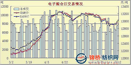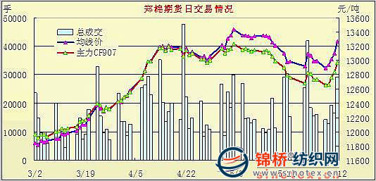2.國內(nèi)棉花期貨先抑后昂,圍繞13000元主軸上下移動。受現(xiàn)貨市場變化影響,鄭棉期貨和電子撮合交易共同點(diǎn)是行情先抑后昂,基本在13000元上下小幅波動。不同點(diǎn)是交投活躍性不一,鄭棉期貨交易好于電子撮合。6月上半月鄭棉期貨各合約主體均價(jià)13029元/噸,比5月份跌231元,跌幅1.7%,日均成交20995手,比5月份日均增加13.5%,持倉總量50620手,比5月末增倉3200手,增幅6.7%。電子撮合MA系列各合約主體均價(jià)12947元/噸,比5月均價(jià)跌211元,跌幅1.6%,日均成交7102噸,比5月日均下降8%,訂貨總量22420噸,比5月末減少4880噸,減幅17.9%。6月份鄭棉期貨和電子撮合運(yùn)行圖示如下: