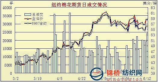 3.紐約期棉進(jìn)2退3,在57-60美分之間整理,但是交投較清淡。受美元走強(qiáng)外圍市場走弱及我國拋儲棉等因素影響,紐約期棉明顯呈縮量整理狀態(tài)。6月份紐約期棉各合約加權(quán)平均主體價(jià)58.08美分/磅,比5月份微跌37點(diǎn),跌幅0.6%,基本在57-60美分之間徘徊。日均成交19047手,比5月份日均減少6200手,減幅48.3%,持倉總量132957手,比5月末減倉1955手,減幅1.4%。紐約期棉交易走勢見下圖:
