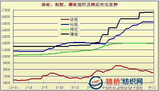5.主要用化纖原料中腈綸創(chuàng)新高漲至17500元居高不下,滌短繼續(xù)小幅回落至8400元,粘短持續(xù)平穩(wěn)16000元。受供需緊張影響,腈綸短纖在5月份大漲1000元后,6月份基本居17500元高位運(yùn)行。主要原因是供需矛盾加劇。一是生產(chǎn)量大幅下降減少。1-4月腈綸短纖生產(chǎn)21.9萬噸,同比減少5.1萬噸,減幅18.9%;二是進(jìn)口量聚減,出口量增加。1-4月腈綸短纖進(jìn)口4.98萬噸,同比減少1.65萬噸,減幅24.9%,出口0.18萬噸,同比增加0.14萬噸,增幅3.5倍;三是庫存減少,無庫存壓力。據(jù)了解,目前部分腈綸生產(chǎn)企業(yè)庫存僅幾天周圍量,無庫存壓力導(dǎo)致6月份腈綸短纖價(jià)格居高不下。但是滌綸短纖在油價(jià)持續(xù)上漲情況下不漲反跌。6月份紐約期貨原油首月期價(jià)平均達(dá)69.47美元/桶,較5月份平均每桶上漲10.44美元,漲幅達(dá)17.1%,其中6月9日后連續(xù)沖破70美元關(guān)口,最高時(shí)達(dá)72.68美元/桶,有專家分析有2009年有可能再沖80美元關(guān)。滌綸短纖在5月份跌破9000元至8600元后,6月份再跌200元至8400元左右。粘膠短纖6月份基本維持16000元不變,此價(jià)位開始進(jìn)入粘短淡季。主要化纖原料走勢圖如下: