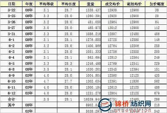 5月22日起國家相關部門通過全國棉花交易市場輪儲150萬噸國儲棉以來,截止6月12日的15天拋儲中,已經(jīng)累計投放29.5533萬噸國儲棉,其中2008年度新棉23.7518萬噸,2003年度成棉5.8015萬噸。實際成交17.205萬噸,其中2003年度成棉全部成交,2008年度新棉11.4035萬噸,2008年度新棉成交率僅為48%,一半以上流拍。初步分析流拍率較高的原因,一是每噸12900元起拍價過高;二是5月31日開始將起拍基準價調降為每噸12600元,并按等級3%和長度1%的價差率計算起拍價后流拍率略下降,但是03-04成棉參入拋儲,淡化新棉競拍;三是倉儲地區(qū)結構影響,邊緣倉儲地的流拍率相當高;四是2008年棉花出現(xiàn)質量不符現(xiàn)象,影響兌拍企業(yè)積極性;五是6月8日開始,03年度成棉同時拋儲和拋儲量的增加,因為其倉儲地相對集中在用棉地,故03年度成棉均100%成交;五是棉花經(jīng)營企業(yè)此間參入,其資金優(yōu)勢大捆成棉大多為其所拍。據(jù)對中華棉花集團總公司競拍統(tǒng)計,從6月8-12日累計競拍8888噸,成交總額10972萬元,平均成交價12344元/噸,其成交的最大捆重2973噸,該捆成交價12110元,質量529級。六是紡織企業(yè)仍然受資金困繞,競拍十分謹慎。