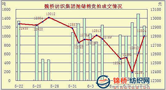 山東魏橋紡織集團始終積極參入競拍。自5月22日拋儲以來山東魏橋紡織集團共成交1.65萬噸,成交總額21079萬元。5月31日2008年新棉起拍價由12900元/噸調降至12600元/噸后,競拍數(shù)量逐日增加。6月8日開始增加2003年度成棉后,由于倉儲地、起拍價低及棉花質量相對穩(wěn)定等原因,將注意力主要集中在2003年成棉,從6月9日開始成交的全部是2003年度成棉。從成交價格看,平均成交價12751元/噸,基本在現(xiàn)行現(xiàn)貨棉價軌跡中。其中08年度新棉成交均價12776元/噸,03年度成棉均價12592元/噸。魏橋紡織集團15個交易日競拍成交情況如下表: