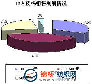 12月皮棉現(xiàn)貨市場基本處于平穩(wěn)小漲狀態(tài)。從調(diào)查企業(yè)看,月內(nèi)企業(yè)銷售利潤不及11月,仍然較為可觀。具體看,銷售利潤在500元以上的企業(yè)占24%,較上月減少10個百分點;200-500元的占41%,增加18個百分點;100-200元的占32%,增加3個百分點;保本無利的占3%,減少11個百分點。