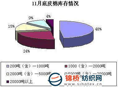 11月國內(nèi)棉價由月初到月中出現(xiàn)冰火兩重天的大轉(zhuǎn)折,月初棉價攀至高點,待國家調(diào)控政策下達后,月中迅速出現(xiàn)急速下滑。隨著價格大幅波動,多數(shù)棉企存棉也由之前大量囤積,到保守性叫停。由于月中下旬價格波動過大,紡企觀望濃厚,棉企庫存量出貨較慢,加之收購繼續(xù)進行,因此本月庫存規(guī)模繼續(xù)增加。從調(diào)查企業(yè)來看,存棉量在200-1000噸的企業(yè)占到48%;存棉量在1000-2000噸的企業(yè)占24%;存棉在2000-5000噸的企業(yè)占15%;9%的企業(yè)存棉量在5000-20000噸;4%的企業(yè)存棉在20000噸以上。(見下圖)