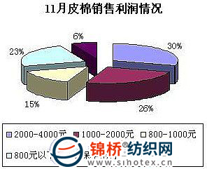 調(diào)查顯示,11月國內(nèi)棉花現(xiàn)貨價格均價較上月漲幅在2000元/噸左右。但是過山車般的行情使企業(yè)的經(jīng)營出現(xiàn)很大差異。一些前期低位收購的企業(yè)利潤情況還可以,但是月內(nèi)高位收購的企業(yè)加工后銷售則明顯購銷倒掛,不過購銷倒掛的企業(yè)多數(shù)堅持囤積惜售,期盼年后順價銷售。棉企經(jīng)營風(fēng)險加大。調(diào)查顯示,銷售利潤在2000-4000的企業(yè)占到30%,較上月減少7個百分點;1000-2000的企業(yè)占到26%,較上月減少3個百分點;800元以下的占23%,;銷售利潤在800-1000元的占15%,較上月減少5個百分點;還有6%的企業(yè)屬于保本無利。(如下圖2月銷售利潤對比)