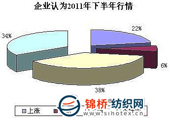 隨著11月國家政策的大力調(diào)控,棉價迅速回落。以中國棉價指數(shù)CCIndex328級為例,月底26248元/噸,較月內(nèi)高點(11月11日)31302元/噸跌5054元/噸,跌幅16%。對于12月及以后行情,多數(shù)企業(yè)認為已經(jīng)沒有太多下跌空間,將可能維持在1個相對合理的區(qū)間內(nèi)。企業(yè)認為國家調(diào)控的目的在于平衡棉價,并不是過度的打壓。調(diào)查顯示,38%的企業(yè)認為2011年上半年棉花將維持平穩(wěn);34%的企業(yè)認為不好說;還有22%的企業(yè)認為繼續(xù)上漲,僅有6%的企業(yè)認為下跌。(如下圖)其中認為上漲的企業(yè)表示本年度供需存在較大缺口,是后市棉價走高的主要原因。