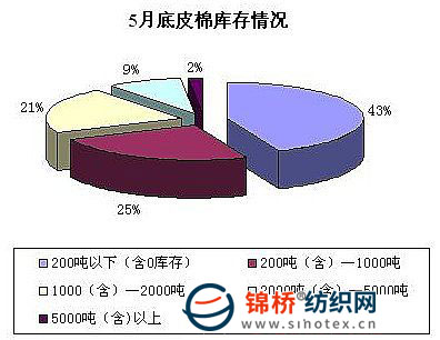 5月份受國(guó)內(nèi)現(xiàn)貨資源偏緊、貨源集中等因素影響,棉價(jià)漲幅繼4月有所加大,主要以中高等級(jí)更為突出。多數(shù)紡織企業(yè)在月中下旬拿到配額,紡企采購積極,多數(shù)企業(yè)加大棉花儲(chǔ)備量,部分紡織企業(yè)棉花庫存達(dá)到3個(gè)月。棉企方面皮棉貨源進(jìn)一步向大企業(yè)手里集中,零星散戶出貨相對(duì)積極。為全面了解企業(yè)庫存、銷售等情況,進(jìn)行此次調(diào)查,現(xiàn)將調(diào)查結(jié)果公布如下: 1、商業(yè)庫存總量246萬噸 通過對(duì)棉花企業(yè)進(jìn)行分省、分規(guī)模抽樣調(diào)查,本統(tǒng)計(jì),截止2010年5月底,國(guó)內(nèi)棉花商業(yè)庫存總量為246萬噸(包括外棉和進(jìn)入流通環(huán)節(jié)的棉花,不包括國(guó)儲(chǔ)棉),較4月底的297萬噸減少51萬噸。其中,內(nèi)地商業(yè)庫存為145萬噸;新疆商業(yè)庫存為(未出疆)101萬噸。內(nèi)地產(chǎn)區(qū)中,黃河流域的冀魯豫三省共有庫存87萬噸,長(zhǎng)江流域的蘇皖鄂湘四省共有庫存40萬噸,其他分散產(chǎn)區(qū)18萬噸。 2、中小型企業(yè)出貨量較大。 截至5月末,被調(diào)查企業(yè)在月內(nèi)出貨多數(shù)較四月積極,企業(yè)庫存量繼續(xù)縮減。月內(nèi)出貨較快的地區(qū)主要集中在華北地區(qū)的山東、河北、河南,長(zhǎng)江流域的湖南、湖北、江蘇等地。調(diào)查顯示,截止5月底,庫存量在200噸以下的企業(yè)占43%,較上月增加4個(gè)百分點(diǎn);庫存量在200-1000噸的企業(yè)占25%,較上月減少2個(gè)百分點(diǎn);庫存量在1000-2000噸的企業(yè)占21%,較上月增加8個(gè)百分點(diǎn);庫存在2000-5000噸的企業(yè)占9%,較上月減少10個(gè)百分點(diǎn);僅有2%的企業(yè)存棉在5000噸以上,與上月持平。