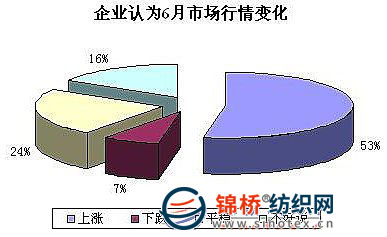 4、多數(shù)棉企對(duì)6月行情繼續(xù)看漲 被調(diào)查企業(yè)中有53%的企業(yè)認(rèn)為6月份棉花市場(chǎng)繼續(xù)上漲;16%的企業(yè)認(rèn)為不好說;24%的企業(yè)認(rèn)為平穩(wěn);還有7%的企業(yè)認(rèn)為下跌。
