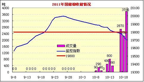 10月19日計(jì)劃收儲(chǔ)33000噸,實(shí)際成交3780噸,其中新疆庫成交3000噸,內(nèi)地庫成交780噸,截止今日2011年度棉花臨時(shí)收儲(chǔ)累計(jì)成交噸10850噸,新疆累計(jì)成交8080噸,內(nèi)地累計(jì)成交2770噸。今日成交主要集中在新疆、湖北、安徽江蘇、天津五省倉(cāng)庫。