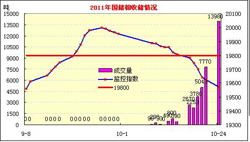 10月24日計劃收儲34100噸,實際成交13980噸,成交比例達到41%,自收儲工作啟動以來,首日成交過萬。其中新疆庫成交11160噸,內地庫成交2820噸,截止今日2011年度棉花臨時收儲累計成交37640噸,新疆累計成交29200噸,內地累計成交8440噸。今日成交主要集中在新疆、湖北、安徽、天津四省市倉庫。