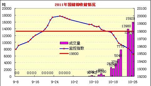 10月26日計劃收儲36000噸,實際成交15920噸,成交比例44%。其中新疆庫計劃收儲17400噸,實際成交12170噸,成交比例70%;內地庫計劃收儲18600噸,實際成交3750噸,成交率20%。截止今日2011年度棉花臨時收儲累計成交65960噸,新疆累計成交51250噸,內地累計成交14710噸。今日成交主要集中在新疆(12080)、天津(270)、湖北(2280)、湖南(300)、安徽(510)、江西(120)、河北(360)等六省市倉庫,成交范圍逐步擴大。