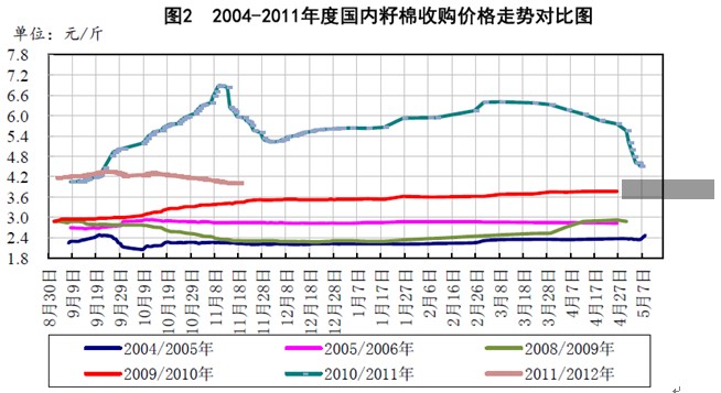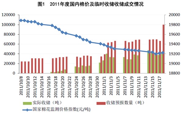 基本面讓位政策面 棉花收儲“量變”或引發(fā)“質(zhì)變” 一、2011年11月份棉花市場回顧 2011年11月份,棉花市場主要有幾點關(guān)注:一、收購價格下跌,棉花收儲成交量放大;二、化纖原料價格持續(xù)陰跌,紗布走勢偏弱;三、中國簽約美棉數(shù)量大增,進口棉配額趨緊;四、服裝出口增速明顯回落;五是全球經(jīng)濟增速放緩,大宗商品普遍回落。
