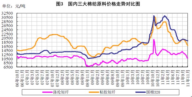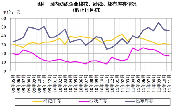 (一)收購價格下跌,棉花收儲成交量放大。 2011年11月份,國內(nèi)皮棉價格有小幅下滑,但整體保持穩(wěn)定,3級皮棉國內(nèi)均價由月初的19405元/噸跌至19195元/噸,月度跌幅不足200元,主要受國家收儲政策支撐。截止11月21日,國家已收儲68.7萬噸,其中內(nèi)地收儲成交19.88萬噸,新疆收儲成交48.82萬噸,占收儲總量的71.1%。國家通過收儲支撐棉價的力度和決心都比較大,目前每日預收儲量擴大至10萬噸以上,成交量在5萬噸左右,預計月度收儲成交量可達到80萬噸。 受到棉籽價格持續(xù)下跌影響,盡管有國家收儲支撐,籽棉收購價格仍呈現(xiàn)下跌走勢,其中新疆棉收購均價下跌至8.6元/公斤左右(衣分在40,水分在13%以內(nèi)),四級棉基礎(chǔ)收購價在7.7-7.8元/公斤,棉籽價格跌至1.70-1.80元/公斤,內(nèi)地籽棉收購均價下跌至4元/斤左右,部分4、5級籽棉收購價格在3.5-3.8元/斤,由于與去年相比,收購價格大幅回落,棉農(nóng)售棉意愿不高,在收儲支撐下,很多棉農(nóng)選擇持棉觀望,市場籽棉銷售進度較為遲緩。 (二)化纖原料價格持續(xù)陰跌,紗布走勢偏弱。 11月份以來,國內(nèi)紡織市場整體走勢偏弱,國內(nèi)滌綸短纖、粘膠短纖價格持續(xù)下跌兩個半月,累計跌幅超過3000元/噸,與棉花價差繼續(xù)拉大。純棉紗從9月中旬以來累計下跌1500元/噸,而國內(nèi)棉價在收儲支撐下跌幅不足700元,328級棉一直在19000元/噸上方運行。 棉價保持平穩(wěn),而紗、布價格下跌導致紡織企業(yè)利潤空間被壓縮,部分原料庫存較高的企業(yè)虧損加大,紡織市場減產(chǎn)、停產(chǎn)現(xiàn)象普遍。紡織企業(yè)原料及成品庫存雖有下降,但整個去庫存化過程進展緩慢。部分企業(yè)因季節(jié)性訂單減少,紗線庫存還有所增加。
