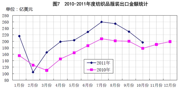 9、10月份,中國進口棉數(shù)量平均在25萬噸左右,預計9-12月,中國進口外棉的數(shù)量將達到100萬噸。但是需要關(guān)注的是,從簽約外棉的企業(yè)看,紡織企業(yè)所占比例并不高,看好后市的棉花企業(yè)和承擔國家儲備任務(wù)的中儲棉公司占了很大的比例。以現(xiàn)貨形式在保稅區(qū)寄售的外棉目前銷售形勢也并不理想,這其中有價格的因素(寄售棉與國內(nèi)現(xiàn)貨價格基本持平),也反應(yīng)紡織企業(yè)對棉價的消化能力較弱。 (四)服裝出口增速明顯回落。 從紡織服裝出口情況看,10月份紡織出口增長保持穩(wěn)定,服裝出口增幅出現(xiàn)明顯回落,其中服裝出口同比僅增長6%,若考慮人民幣升值因素,以人民幣計價的服裝出口總額是零增長甚至負增長。服裝出口額較上月下降18.8%,出口增速較上月減少7.8個百分點。10月份紡織品出口同比增長18.4%,環(huán)比減少6.3%,但出口增速較上月增加1.7個百分點。 從廣交會出口接單情況看,紡織品服裝前三日累計成交額較上年同期增長6.15%,其中對歐出口增2.2%,對美出口增39%,對日出口增13%。歐盟是中國紡織品服裝的最大出口市場,占出口總額的1/5,紡織品服裝對歐出口增速出現(xiàn)明顯下降,若考慮單價大幅上調(diào)15-25%,2012年對歐出口紡織品服裝總量將出現(xiàn)較大幅度下降,2012年上年度整體出口形勢不容樂觀。