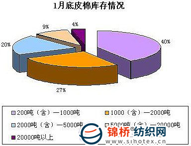 1月國內(nèi)皮棉現(xiàn)貨價格繼12月底上漲行情繼續(xù)推高,市場成交相對活躍。不少企業(yè)因春節(jié)臨近,適當收購加工,完成年底前的庫存積累,因此年底棉花的庫存量繼續(xù)增加。另外,調(diào)查顯示,高等級棉的出貨需求較大于低等級棉,因此新疆棉無論價格還是受歡迎程度都明顯好于地產(chǎn)棉。從調(diào)查企業(yè)來看,存棉量在200-1000噸的企業(yè)占到了40%,較上月增加2個百分點;存棉量在1000-2000噸的企業(yè)占27%,較上月減少2個百分點;存棉在2000-5000噸的企業(yè)占20%,較上月增加2個百分點;9%的企業(yè)存棉量在5000-20000噸,較上月減少2個百分點;4%的企業(yè)存棉在20000噸以上,與上月持平。(見下圖)