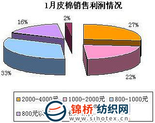 調(diào)查顯示,1月國內(nèi)棉花現(xiàn)貨中高等級均價較上月漲幅在900元/噸左右。受傳統(tǒng)春節(jié)影響,不少紡織企業(yè)積極補充庫存,國際棉價攀升,國內(nèi)市場成交價格上揚,不少棉花企業(yè)本月銷售獲得相應(yīng)利潤空間,銷售利潤較12月份出現(xiàn)溫和的轉(zhuǎn)變。調(diào)查顯示,銷售利潤在2000-4000的企業(yè)占到27%,較上月增加7個百分點;1000-2000的企業(yè)占到22%,較上月增加3個百分點;800元以下的占16%,較上月減少1個百分點;銷售利潤在800-1000元的占33%,較上月減少4個百分點;還有2%的企業(yè)屬于保本無利,較上月減少5個百分點。(如下圖)