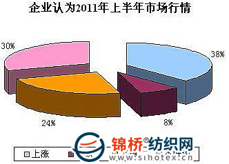 2011年年初國際一些棉花產(chǎn)國災(zāi)害不斷,受澳大利亞棉花主產(chǎn)區(qū)洪災(zāi)影響棉花大幅減產(chǎn),美元指數(shù)走勢由強轉(zhuǎn)弱、而巴西洪水災(zāi)害面積擴大、中國貿(mào)易投資促進團赴美簽約采購美國德克薩斯棉花和印度政府保持對棉花出口的限制政策等因素影響下,國際棉花價格連續(xù)大幅上漲。從1月18日至1月25日,紐約棉花期貨連續(xù)上漲六個交易日,累計漲幅超過14%,并且漲幅突破美國歷史最高。而國內(nèi)電子盤上漲比較迅速,其中鄭期漲幅超過10%。國內(nèi)現(xiàn)貨市場跟漲有了非常明確的風(fēng)向標。從一月份以來棉花現(xiàn)貨報價不斷上調(diào),大部分企業(yè)雖謹慎,但看漲熱情均比較高。調(diào)查顯示,38%的企業(yè)認為2011年上半年棉花行情將上漲;30%的企業(yè)認為不好說;還有24%的企業(yè)認為平穩(wěn);只有8%的企業(yè)認為下跌。(如下圖)