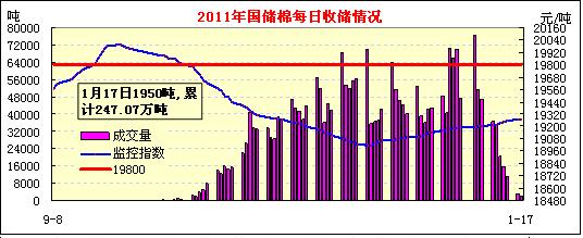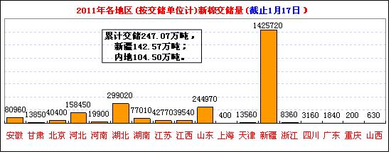 1月17日計劃收儲121500噸,實(shí)際成交1950噸,成交比例2%,日成交量繼續(xù)大幅減少,春節(jié)臨近,多數(shù)企業(yè)停業(yè)過節(jié)是主因。其中新疆庫計劃收儲37000噸,全部流拍;內(nèi)地庫計劃收儲84500噸,實(shí)際成交1950噸,成交率2.3%。截止今日2011年度棉花臨時收儲累計成交2470740噸,新疆累計成交1518600噸,內(nèi)地累計成交952140噸。