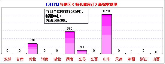 按倉儲庫收儲匯總:當(dāng)日收儲量較多的地區(qū)依舊為:山東庫收儲1020噸,占52.3%;湖南570噸,占29.2%;河北270噸,占13.8%。截止1月17日,新疆庫累計收儲151.86萬噸,占61.5%、湖北28.16萬噸,占11.4%;山東22.95萬噸,占9.3%、河北14.80萬噸,占6.0%、湖南80550噸,占3.3%等。