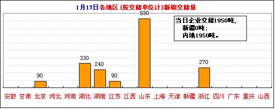 按企業(yè)交儲匯總:當(dāng)日交儲較多的地區(qū)為:山東企業(yè)交儲930噸,占47.7%;湖北330噸,占16.9%;浙江270噸,占13.8%等。截止1月17日,新疆企業(yè)累計交儲142.57萬噸,占57.7%、湖北29.90萬噸,占12.1%;山東24.50萬噸,占9.9%、河北15.85萬噸,占6.4%、安徽80960噸,占3.3%、湖南77010噸,占3.1%等。